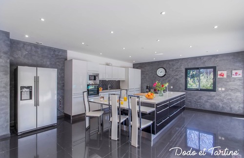 The kitchen is spacious and equipped with all the necessary items to prepare all your dishes : cooking plates, oven, pots, pans, stews, microwaves, large refrigerator with freezer and ice cube dispenser, juicer, kettle, several types of coffee maker including Nespresso, toaster, blender (for smoothies and milkshakes), dishwasher, as well as many accessories and cutlery.