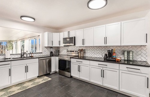 Plenty of space and entertainment for everyone! Our Family room offers a 75-inch TV and a kids' corner! The living room comes with a 65-inch TV and the master bedroom comes with a private TV. Enjoy an open main level with a peaceful sunroom and a fully stocked kitchen. Whether you are here for a family event, celebration, or work travel, the hot tub and sauna will come in handy to make your experience relaxing! Each bedroom offers king beds for a perfect sleep after a long day!