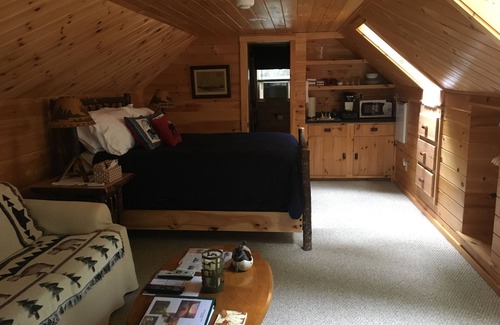 A charming guest suite located on a private 58 acre compound on West Garland Pond. Enter on a private road, cross a tranquil stream and leave your stress behind. This suite is situated on the second level above the garage. You will feel like you are sleeping in the clouds! The property is a lovely centrally located waterfront property in Garland, ME, only 26 miles from BGR (Bangor Airport) and 77 miles from beautiful Acadia National Park. If you are looking for a little piece of heaven, this is the place for you. Relax, read a book, take a nap, enjoy a hike, or visit one of the many nearby destinations. Moosehead Lake Region and quintessential New England towns like Bar Harbor, Camden and Rockport are all convenient day excursions from camp. This is a one-of-a-kind property!