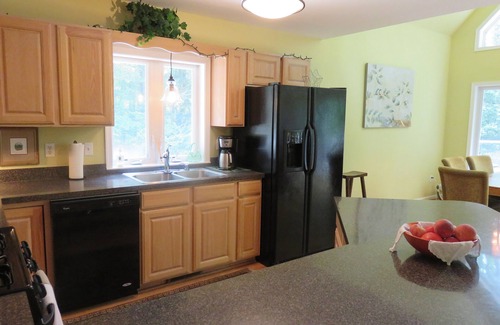 River House offers a master bedroom with a king bed and ensuite. There is a quiet guest room on the first floor with a queen bed, a couple of steps from the second full bathroom. Additional guests could be accommodated with a queen air mattress. A wash and drier are down the hall in the laundry room. The living room provides Direct TV on a large screen next to the gas fireplace. There is a shared dock for boat access, kayaking and fishing.