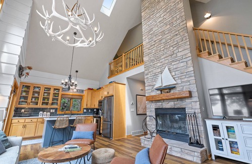 Just up the steps is a large loft partially open to the living room below. This space has a triple twin bunk bed in addition to 3 more beds. There is also a full bath. The loft has ample space for playing board games, reading a book, or just sneaking away from the group to enjoy some peace and quiet.