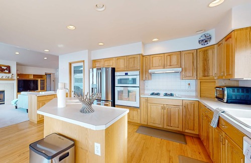 Step outside to enjoy convenient beach access right at your doorstep, where you can immerse yourself in a variety of water activities such as kayaking, stand-up paddleboarding, and sailing. After a day of adventure, retreat indoors to the inviting living room, complete with a gas fireplace and a DVD player for cozy movie nights. The fully equipped kitchen boasts modern appliances, making mealtime a delight, and the gas grill on the patio is perfect for hosting barbecues with stunning waterfront views.