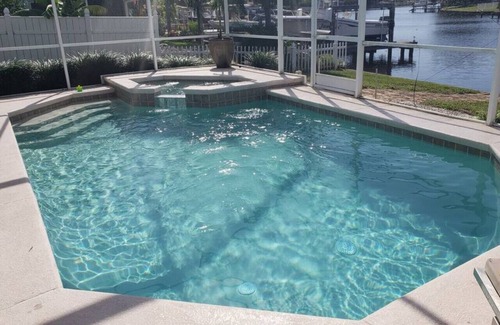Please note that we only provide heat for the pool in the winter months. There is a "spa" feature to the pool where you can enjoy bubbles, but it's not heated. Also, although the back yard is fenced, the canal is not fenced off and serves as a natural barrier. That said, please do not leave children unattended in either the back yard or the lanai. It's best to always be cautious around water. If you would like the child safety barrier installed around the pool before your arrival we would be happy to set it up for you.