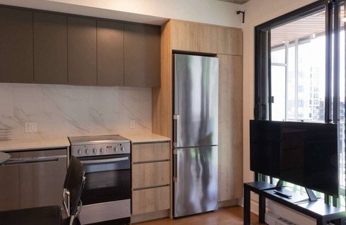 Stay in a sleek, light-filled studio steps from the Lachine Canal—perfect for jogging, cycling, and waterfront strolls. Nestled in the heart of Griffintown, you’ll be surrounded by trendy cafés, top-rated restaurants, and lively bars.