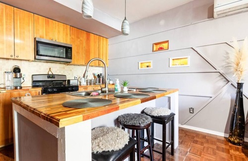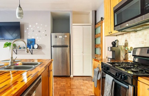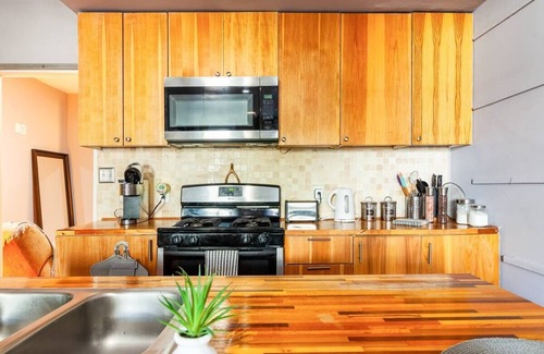 The apartment features custom wood cabinetry, hand-crafted butcher block countertops, and a fully equipped gourmet kitchen. You’ll find fresh linens and towels, a Smart TV, fast Wi-Fi, and a brand-new Queen Nectar bed for a restful night’s sleep.