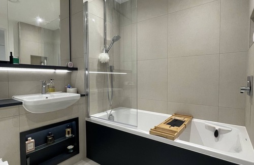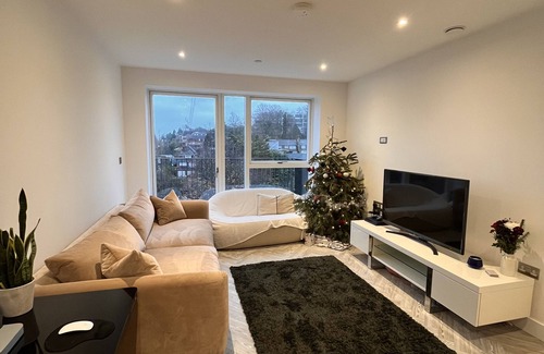 *Brand New* luxury apartment in NW2 a short relaxing walk from Hampstead village, close to tube stops, pubs and restaurants... clean & modern 1 bedroom, perfect for a getaway or work space with excellent links into central . Large living space with open plan kitchen and a hot tap (instant boiling hot water),microwave, oven and dishwasher. The living area is furnished to high standards including a loaf sofa, cable TV, Playstation, adjustable electric desk for standing or sitting and an ergonomic chair. The large balcony hosts spectacular views ... This contemporary bathroom is fully equipped with separate mood lighting, bath and shower. Washer dryer and storage unit among other amenities. Adjustable under-floor heating in each room.