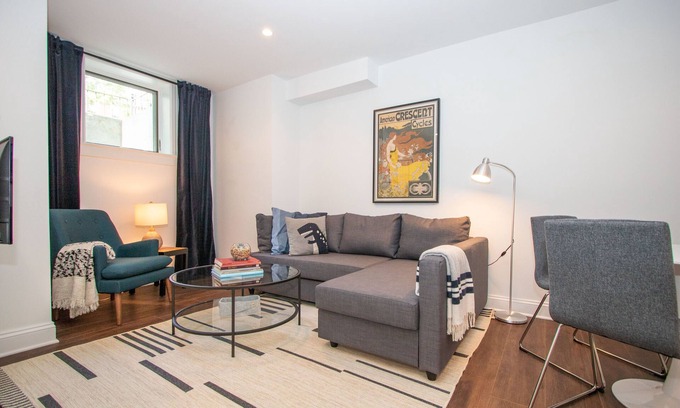 While it's a lower level, the space is warm, bright, quiet and roomy. Original doors and door hardware were preserved but the bathroom and kitchen are the epitome of new and nice. The living room is open and features high-speed internet, smart TV and a fold-out sofa bed. The entire unit features heat and central air conditioning too, and there is a full-size washer and dryer for your use.