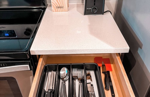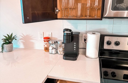 • Fully equipped kitchen with stainless steel appliances, cookware, and coffee maker
