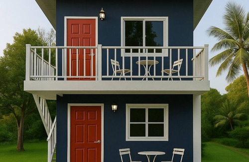 Comfortable, stylish beach bungalows in a newly built, modern two-story building, featuring clean lines, vibrant colors, and breezy outdoor spaces perfect for relaxing in a tropical paradise. Super quiet area.