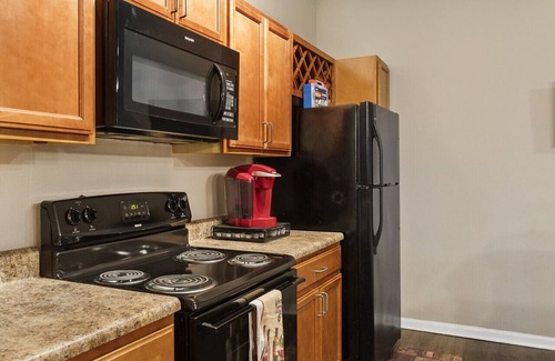 Mid-City Serenity Oasis is a spacious retreat in a gated Huntsville community, perfect for families, contractors, and professionals. This three-bedroom, two-bathroom apartment comfortably sleeps up to 6 guests and offers a true master suite experience. The master bedroom boasts a luxurious king-size bed designed for ultimate relaxation, paired with a private en-suite bathroom. Step directly from your bed into a spacious, beautifully appointed bathroom, giving you a private retreat within your stay.