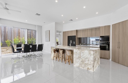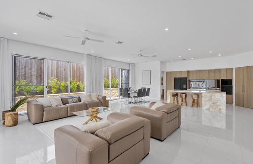 This beautifully designed single-level home offers a seamless blend of luxury and comfort. With four spacious bedrooms, including three with en-suite bathrooms, this property is perfect for large groups or families. The living area features plush seating for nine, a flat-screen TV with streaming services, and stylish décor, creating an inviting atmosphere. The open-plan kitchen boasts an induction stovetop, electric oven, and all essentials, while the dining area comfortably seats eight, with additional seating for three at the countertop.