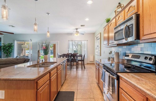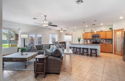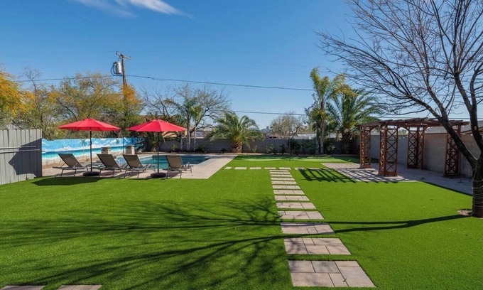 This spacious home offers 4 comfortable bedrooms with 6 beds and 2 bathrooms including a King master bedroom, queen bedroom, and two bedrooms with Bunk Beds. Relax and recharge in the sparkling pool. This home also features a fully-equipped and open-concept kitchen with a large living room and dining table well-suited for all families and large groups! Outside you will find an additional lounge area for dining or cocktails and a scenic backyard with lush desert landscaping including a putting green, garden lights, barbecue grill, and more. Come enjoy this Phoenix Villa for your next vacation! Stay cool under the Arizona sun with misters surrounding the covered deck, offering a refreshing outdoor retreat even on the hottest days. Enjoy endless outdoor entertainment with a private putting green, perfect for friendly competitions, and an electric pump for all your float toys, so poolside fun is always just moments away.