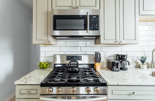 The apartment includes one full bathroom, with a shower, sink, and toilet. We’re all about helping you look (and smell) your best, so we provide shampoo, conditioner, and body wash in addition to hand soap and fluffy towels. Trust us when we say there’s no better way to warm up after a Windy City walk than a hot shower!