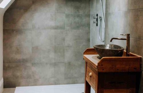 The loft room bedroom on the 2nd Floor - This unique space is a light contemporary space complete with king size bed, sofa bed and work/living space. With one Velux window and one Dormer window light is allowed to come in from both sides making it feel light and airy. This bedroom has a king Size bed, a sofa bed (Sleeps One) and relaxed seating area. This offers a second living space in front of a smart TV. The Tunnel room has the luxury of a walk in shower room and also a walk in dressing room.