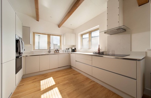 On the same floor, a spacious living room has been furnished in a contemporary style and features two stylish sofas, a large armchair along with a wall-mounted TV and Sony PlayStation. A lovely space to retreat together for relaxing evenings after days out exploring the local area. The kitchen has recently been fitted with white modern sleek units, and all your modern day appliances. These include an oven with hob, fridge/freezer, microwave, dishwasher, and coffee machine. A handy utility cupboard in the hallway is home to a washing machine and other cleaning appliances. For dining, there is a large dining table and plenty of seating for 4 guests in the kitchen.