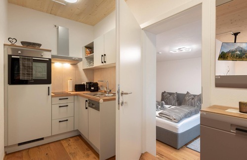 Stylish apartment in an idyllic, quiet location, directly on the cycle path and only 650 metres from the ski bus. The apartment offers a living/dining room with an extra bed, a fully equipped kitchen, a bedroom with a comfortable double bed and a modern bathroom with shower, WC and washbasin. Hiking trails start right outside the door and a parking space is also available - ideal for a relaxing holiday!