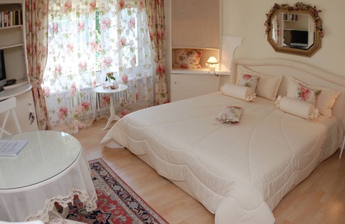 In our romantic country house in a very quiet location, we rent a holiday apartment for guests who appreciate a beautiful ambience. We live in the same house only one floor up, but with a separate entrance. The lovingly designed garden offers pure relaxation. The bright and tastefully furnished rooms, all with views of the garden, invite you to linger. In each bedroom there is TV, WIFi in all areas, 2 large bathrooms one of them with bathtub, - 2 toilets Infrared sauna, fully equipped open kitchen with coffee machine, microwave, dishwasher, oven and breakfast bar. Living room with dining area and comfortable sofa bed, TV,