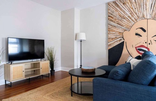 On Newport’s vibrant Broadway, this second-floor apartment offers an easygoing home base with lively energy downstairs and relaxed comfort above. Two queen bedrooms, a full kitchen, and thoughtful design details make it ideal for couples or friends exploring the city. Bold, original artwork adds personality throughout, and the walkable location puts dining, shops, and waterfront strolls just minutes away.