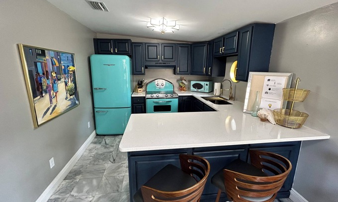 Our vibrant kitchen combines vintage charm with modern convenience. Highlighted by a striking teal refrigerator and matching appliances, the kitchen’s retro flair is complemented by dark blue cabinetry and sleek white countertops. Whether preparing a quick breakfast or a gourmet meal, the fully equipped kitchen meets all your culinary needs. Adjacent to the kitchen, the dining area with its wooden bar stools provides a cozy spot for meals or a cup of coffee, creating a delightful nook to start or end your day.