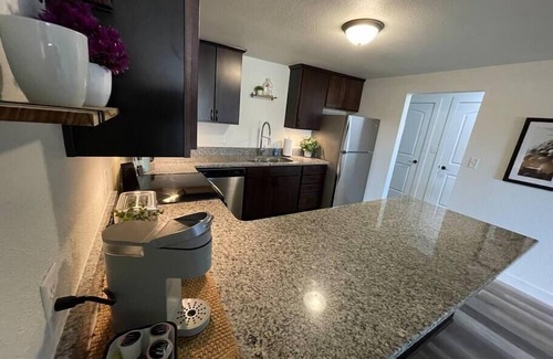 Welcome to our Modern Chic Oasis, a luxurious and stylish retreat located just outside of the heart of the city and only about 5 miles from Lambeau Field. This beautifully designed and newly renovated apartment is the perfect place to unwind after a busy day exploring all that the DePere has to offer. The apartment boasts a sleek and modern aesthetic, with high-end finishes and designer furnishings throughout. The open-plan living and dining area is flooded with natural light and features a comfortable sofa, armchair, and a 65' flat-screen TV. The fully equipped kitchen includes top-of-the-line appliances and everything you need to whip up a delicious meal. The bedroom is a true sanctuary, with a sumptuous king-size bed dressed in high-quality linens and plush pillows. The room is tastefully decorated with chic accents and features a large closet for your belongings. The bathroom is just as stylish and boasts a spacious walk-in shower and fluffy towels. Located in the heart of the city, apartment residence is just steps away from the best restaurants, cafes, and boutiques. Whether you're here for work or leisure, you'll be perfectly positioned to explore all that the city has to offer. Book your stay today and experience the ultimate in style and comfort! We provide a 24/7 contactless check-in and check-out process.