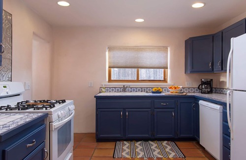 A generous-sized kitchen has all of the essentials for cooking a "New Mexican" meal. The semi-open concept dining/living room is stylish and warm with plenty of seating.