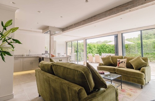 Bi-fold doors to the courtyard, central island with granite worktops and two bar stools, electric oven, induction hob, fridge with freezer section, wine fridge, microwave, dishwasher, kettle, toaster, cafetière, Nespresso coffee machine, four-seater dining table, gas fire, Smart TV with apps, two three-seater sofas and desk with chair