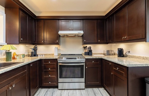 The fully stocked kitchen comes with all the basics for cooking and baking, plus a dining area perfect for shared meals. A private bar adds a fun touch for evening cocktails or casual hangouts.