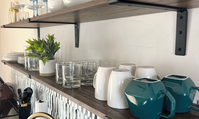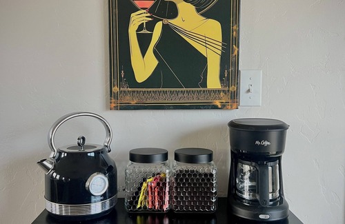 There's a full kitchen with all the cookware, tableware, and utensils you'll need to cook full meals at home. Coffee and tea are provided for you as well as wine glasses, champagne flutes, coupes, and a cocktail shaker!