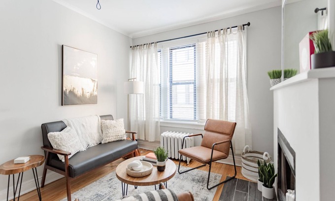Best-rates for the Stylish|Cozy Getaway in Lakeview|1BR|3min~Wrigley starts from $422 per night with includes Kitchen, Laundry, Parking, Pet Friendly, Security/Safety, Bedding/Linens, Wellness Facilities, Fireplace/Heating, Guest Services, Internet, Air Conditioner, TV, Child Friendly with all other amenities. Perfect for Weddings is committed to ensuring every guest experiences a comfortable and extraordinary stay, whether planning a romantic getaway, a honeymoon, a pet-friendly stay, or celebrating with the entire wedding party.