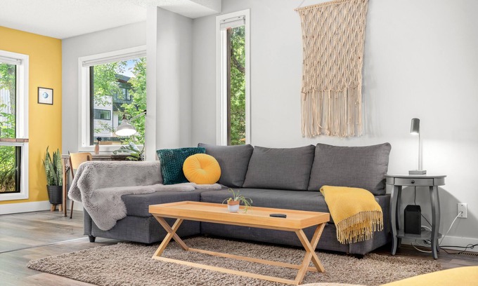 You enter this unique space to feature a geometric mural which matches the energy of this vibrant community. Elegant, spacious and open living space featuring a nice soft shag rug and modern coffee table and a bright comfy yellow chair. The beautiful living room mural was painted by a local artist. Enjoy a restful evening in the living room by resting on a comfy sectional couch wrapped around a throw blanket and enjoying your favorite TV show or movie on the Smart TV that includes Netflix and Disney+; or turn on your favorite tunes on the wireless speaker that also lights up as a lantern. Sectional couch which easily pulls out into a sofa bed for one or two extra guests. Beautiful vinyl plank flooring throughout the spacious living room area, dining room, kitchen and bedroom. Sit down and read a book in a bright sun room situated in front of large bright windows that allow plenty of sunlight into the space surrounded by beautiful green plants.