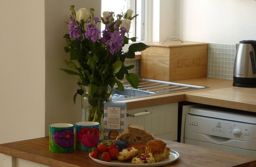 A short walk from the private parking space, you will find a small front garden and the private entrance to the cottage. There is a small entrance hallway with space for shoes, boots and hanging coats, leading into a bright and spacious sitting room with plenty of comfortable seating, a wood burner, built in cupboards housing a selection of games and local information. There is a large TV with Sky channels, a DVD player and wifi broadband. The sitting room leads into a beautifully presented kitchen with dining area to the left and kitchen area to the right. The kitchen is fully equipped with slimline dishwasher, single oven with electric induction hob, large fridge with small freezer compartment. To the back of the dining area are doors leading out to the small east facing private patio area, suitable for a BBQ after a long day on the beach!