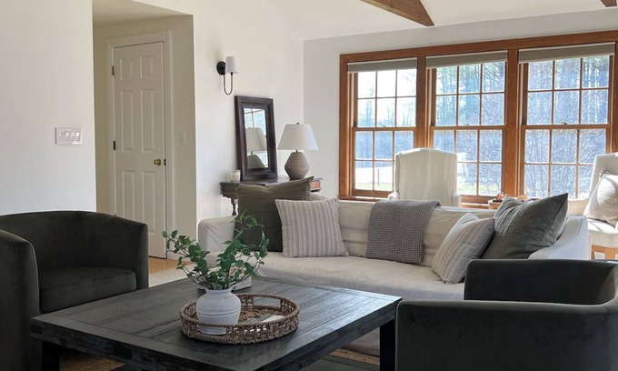 Welcome to our Charlotte home, renovated in 2023. It features light-filled interiors, including two living rooms with exposed beams, a spacious kitchen and dining area, large bedrooms, 2.5 bathrooms, and a west-facing deck. Set on a 2-acre lot with a historic two-car barn, it's near Lake Champlain, parks, hiking trails, and local dining. A 20 min drive to Burlington and Middlebury and only 60 min to Stowe. It's ideal for families/groups of 4-6 seeking comfort and convenience in a scenic setting.