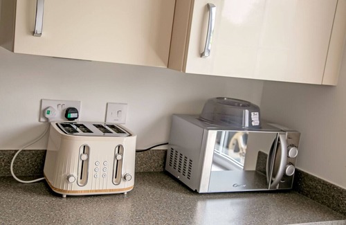 - A modern kitchen fully equipped with oven, microwave, toaster, kettle, and essentials