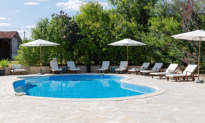 Relax in this stunning newly-renovated gîte with a large private swimming pool in the heart of the beautiful Charente countryside. It's surrounded by Cognac vineyards and on the edge of a historical village. The gîte is set around a tranquil courtyard and has been lovingly restored in 2022 to the highest of standards with your comfort in mind.