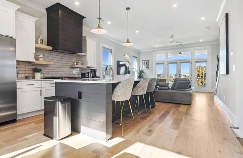 Heading upstairs to the middle floor, you will find the beautiful living room with an expansive open concept kitchen with appliances including a side-by-side refrigerator; dishwasher; Keurig coffee maker with complimentary coffee, creamer, and sugar; toaster; cooking pots and pan; blender; and a pantry with capacious storage and microwave. The middle floor also features the dining area, heightened with a bold accent wall. Also on this same level, you have a gorgeous guest bathroom with a concrete sink. This floor also has a French door leading out to a covered patio with outdoor seating for a great relaxation.
