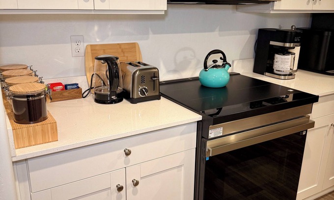 The fully equipped kitchen includes brand-new appliances, cookware, and both a drip and pod coffee maker. Unwind in the stylish living area with a smart TV and high-speed WiFi. This solar-powered home is designed for eco-friendly living, providing a sustainable yet luxurious stay.