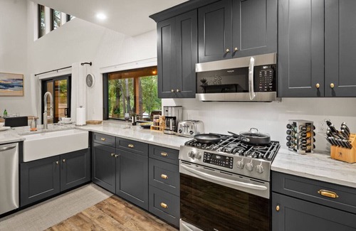 Inside, the split-level design creates a spacious, airy feel with lower- and upper-level windows flooding the space with natural light and offering stunning views of the lush outdoors. The open-concept living area includes a stylish sectional sofa that converts to a queen-sized sleeper, an electric fireplace, and patio doors leading to the back deck. The modern kitchen boasts sleek cabinetry, high-end appliances, and a quartz countertop that extends into a breakfast peninsula and passthrough bar for easy indoor-outdoor entertaining.