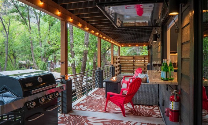 The downstairs living space and upstairs master suite open onto two spectacular tree-lined decks. The shaded lower deck is packed with amenities, including comfy lounge seating, Adirondack chairs, all-season rugs, a fire pit, a barbecue grill, and a 6-seater hot tub (photo coming soon). Upstairs, a large wrap-around deck with loungers, a coffee table, and hammock is the perfect spot to soak in the beauty and sounds of Oak Creek Canyon.