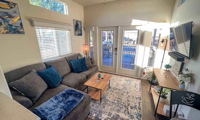 Experience resort-style living without the high fees. Our brand-new Tiny Home boasts 388 sq. ft. of thoughtfully designed space, fully equipped with modern amenities. Step through the French doors into a living room with a comfortable sectional, cozy blankets, and pillows. Enjoy dedicated Wi-Fi at 60mbs, a smart TV with streaming options, and a charging station.