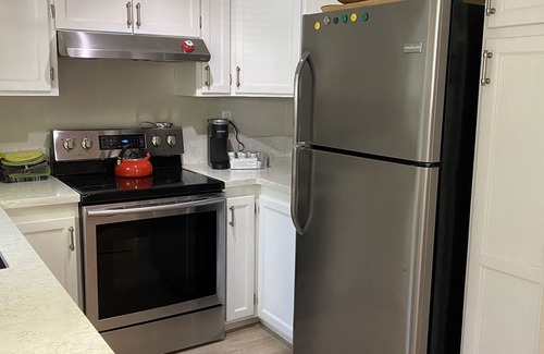 Enjoy discounted weekly & monthly stays. Enjoy your own modern & private separate ground floor flat in our totally restored Victorian. Quiet street, historic district. Only 3 blocks to cool shops/downtown. Your own patio, private entrance, light & roomy, EZ street parking, well equipped full size kitchen, a desk, in unit w/dryer, quality linens, cleaning supplies. Great for couples, wfh, to visit relatives, exploring the coast, or relocating. Please NO parties or gatherings. 2 person maximum (child under 12 okay if requested), no smoking or pets, no parties or gatherings. Perfect for getaways, a home office retreat, or an in-between homes staycation. Gated separate entrance: the ultra clean flat is sanitized, with no shared air exchange. Airy and light full ceiling height, with a front garden view. Easy first floor access with one step in a stylish updated 1900 Victorian. Our home is actually a triplex, we live upstairs and there is one additional Master Suite unit (separate entrance and patio) we use for family that you share one wall with. Occasional faint footsteps and plumbing sounds may sometimes be heard. We value our visitors privacy, but are available if you have questions or need recommendations. This Flat is a legal separate apartment, not a converted garage or add-on, with convenient street parking right up front. Fresh top quality top to bottom remodel, all new hardwood floors, well equipped high end stainless steel kitchen with full size stove/oven, dishwasher, big fridge. A spacious 640 sq feet with comfy large living room, master bedroom, full bath with tub, new 55” Smart TV, air conditioner, room fans, ironing set up, your own brand new washer dryer inside your apt (free of course), your own on demand water heater, cable and fast wifi. Comfortable queen bed with quality linens in large bedroom, full closet, two desks, and a daybed in the living room for lounging or a nap! Patio under a mature redwood tree for morning coffee or an evening cocktail. Nice light and airy place to work inside or out. Front and side gardens are lush and flowering. Your Petaluma "perch" is so close to downtown it takes mere minutes to enjoy pick up or home delivery dining, hiking, biking, popping out to the coast, or a quick kayak in the river. The mansion studded Oak Hill Brewster Historic District neighborhood is downtown without the noise or traffic! Very friendly and quiet neighbors. Enjoy Victorian architecture and lovely garden scenes as you stroll the neighborhood...