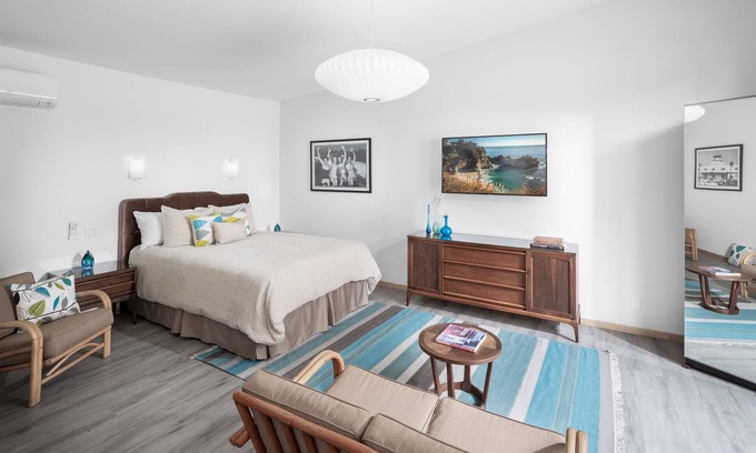 Bathe in the sunshine in this 1950s California ranch house, kick back on the patio, or relax poolside. Your rental gives you a completely outfitted private studio with queen bed and bath, living area, full kitchen with refrigerator, range and oven, microwave and Keurig coffee maker. Private entrance and parking. The studio is decorated with a unique retro charm and features large windows (black out shades for evening) and mid-century furnishings. Guests will love the location. Enjoy all common areas such as patio, pool and outdoor seating area.