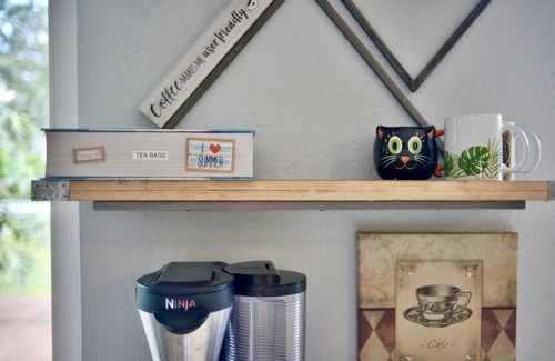 With its bright and airy open concept layout, the entire space is adorned in a tropical jungle themed décor (look for animals around every corner), you enter the house into the living room, which boasts a comfortable three-person couch and chair and a large HD smart television. A nook close to the living room houses a very eclectic, raw wood desk with chair for all of your business needs. Pens, pencils, paper, envelopes, etc are provided in the desk drawers as well. Secure, 75mbps Wi-Fi Internet included, of course!