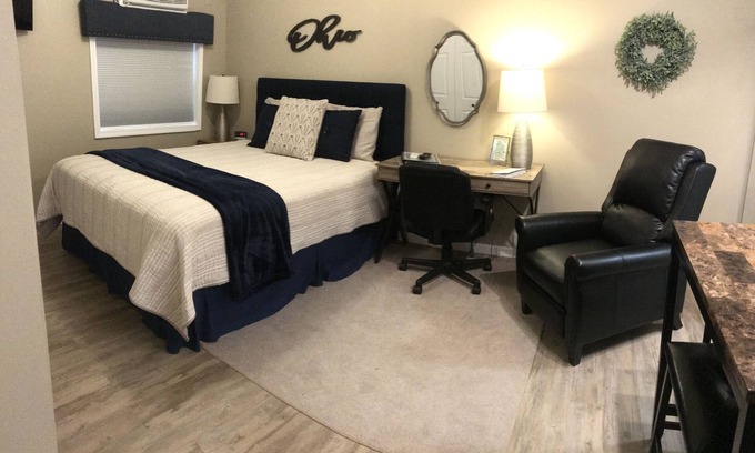 This cozy apartment enters through a shared hallway and has been recently updated from floor to ceiling with new cabinetry and renovated kitchen and bathroom. Kitchenette with full refrigerator, apartment size stove, microwave, granite counter tops, and Keurig coffee maker. Kitchen is supplied with basic cooking supplies and dishes. Full bath with shower unit. Desk and comfortable office chair are also available in the apartment to accommodate our business travelers. Wifi is available throughout the unit. Washer and dryer are located right outside of unit in central hallway.