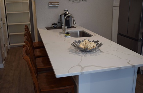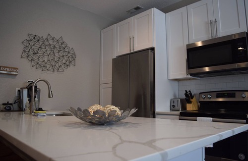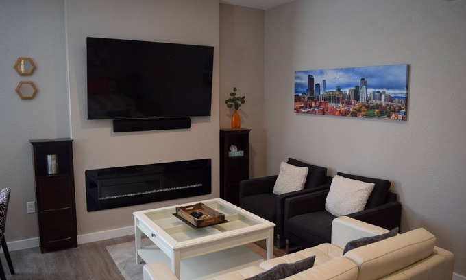 Kick back and relax in this calm, stylish space. The smart Roku TV with Vizio sound bar sit above an electric fireplace. The TV gives you access to all your steaming services. The full kitchen gives you the option to cook, or with the central location you can choose from the many nearby restaurants and bars. There is an awesome queen sized bed and large bathroom with a shower. The desk and monitor gives you the ability to work during your stay.