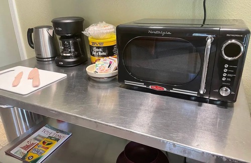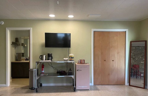 The Rock Room was built in the 1960s. It features a stunning masonry rock wall, authentic terrazzo floors, a queen sized bed (a purple mattress!), and a full bathroom, as well as a coffee bar, a lounging area, and a dinette table/computer workspace. This room is conveniently located ½ mile away from the headwater of the beautiful San Marcos River, and a 5 minute drive (20 minute walk) from the San Marcos square. Only 40 minutes to downtown Austin, and 45 to San Antonio, you will love the convenience of this location. San Marcos has many locally run businesses and restaurants that are listed in our guest book. Experiencing the local flavor of our town will make for a one of a kind experience. This studio space does not include a full kitchen, but it does have a mini fridge, microwave, coffee maker, and other basics for reheating food or preparing light snacks. Looking to get out in the evening? San Marcos has a vibrant nightlife and is very walkable! Don’t feel like walking? Anywhere you will want to go is a short jaunt in an Uber or Lyft!