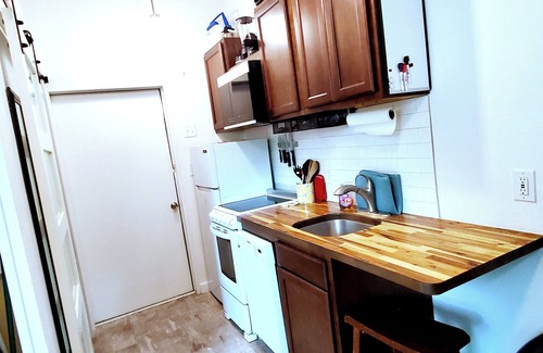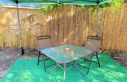This studio unit is stylishly decorated with a small but full kitchen, a beautiful tile shower, and it's own private entrance and outdoor area, including a fully fenced backyard. The living area has seating for 2, and a medium firm Queen bed.