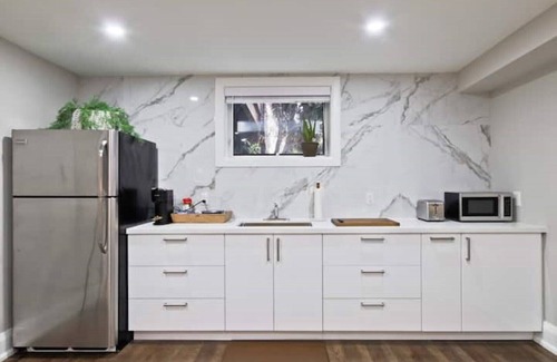The newly renovated and professionally designed space is located in our family home. The space contains a kitchenette, living room, workspace, bedroom, and a dedicated 5-piece washroom accessed through a shared hallway. During your stay you can enjoy a Nespresso Vertuo coffee machine, Napoleon fireplace, 46" Samsung smart TV loaded with Amazon Firestick favorites, and a luxurious foam mattress.