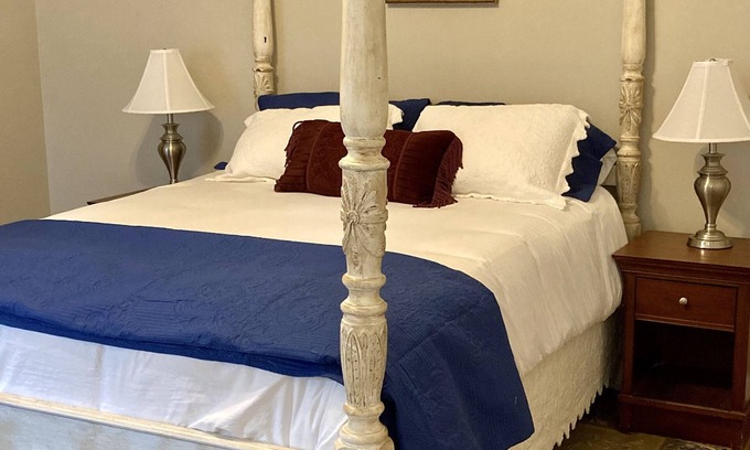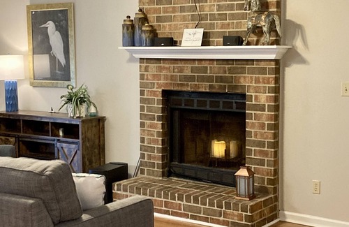 "Phenomenal" Stylish Town-home tucked back off the main street in a quiet collection of same. Walking distance to restaurants like Jim & Nicks BBQ, Starbucks, Fried Green Tomatoes. Walmart's there too for groceries and such! Gas; Circle K on the corner! Come back home and sit in in front of the fire-place and watch your big-screen Roku-Tv or surf the internet, or make a cell call on the high-speed wireless signal. Then grab a snack and a cup of coffee off the breakfast bar, or go ahead and cook a full meal in the kitchen. Dishes, no prob; got a dishwasher! Dirty Clothes? No prob; got a washer and a dryer! Friends want to visit; no prob, have a formal dining room and guest bathroom in the hall-way. Also, patio out back with fire-pit for cozy conversations. Tuckered out? No prob, lay your head down on the 4-poster bed in the Master Bedroom with your own, luxurious bathroom and your own exit out onto the patio.