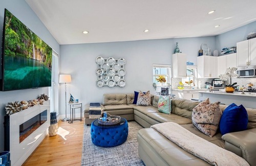 Let's start our tour in the spacious, bright, contemporary open design living area, which combines the entertaining living room, fully equipped kitchen, and inviting dining area. Move around the home to discover four highly comfortable bedrooms with king and queen beds designed to offer the ultimate rest and relaxation after a day of experiencing the picturesque Delray Beach!