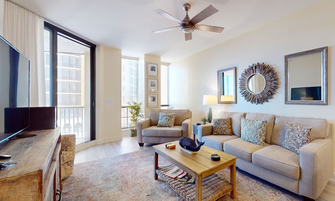 Sunlight pours through glass balcony doors in the living room. A full-size sleeper sofa and two armchairs offer plenty of seating for socializing or watching TV on the 55” flat-screen.